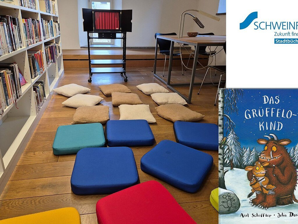 Einmal im Monat lesen wir in der Stadtbücherei Schweinfurt im Ebracher Hof Kindern ab 4 Jahren eine Geschichte aus einem Bilderbuch vor. Das Besondere daran: Die Bilder zur Geschichte werden im Großformat in einem Kasten präsentiert und können von den Kindern die ganze Zeit über betrachtet werden, während vorgelesen wird.