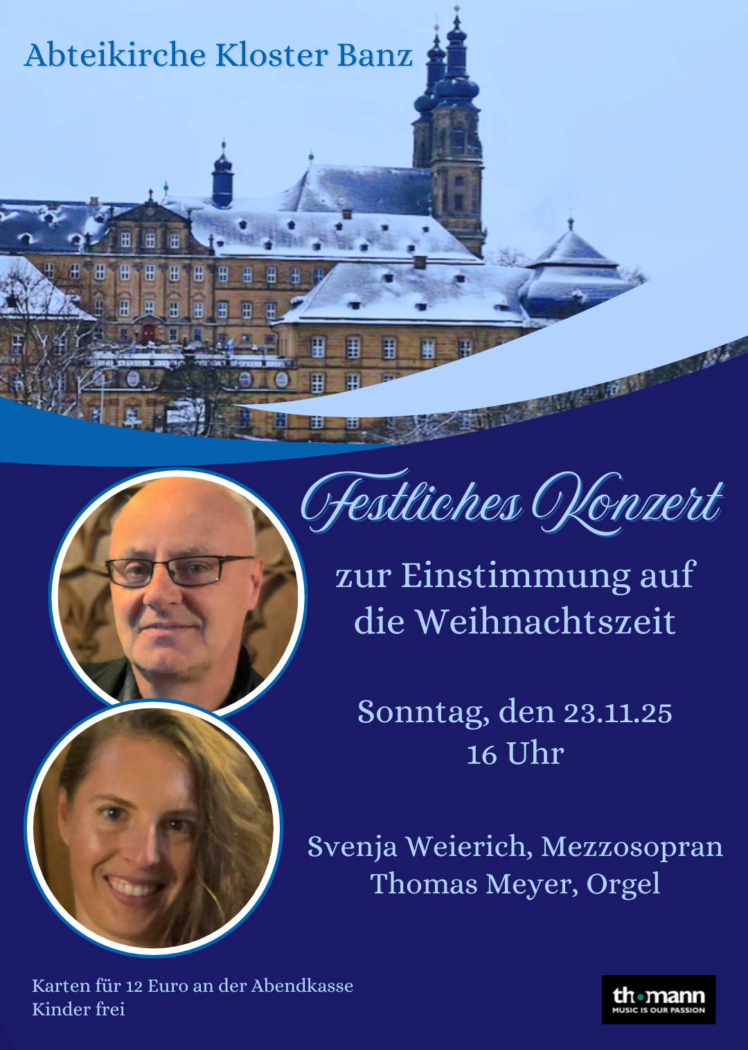 Nun werden die beiden ein festliches Konzert zur Einstimmung auf die Weihnachtszeit am 23.11.2025 um 16 Uhr in der Abteikirche von Kloster Banz gestalten. Schließen Sie die Augen und genießen Sie bekannte Werke aus der Advents- und Weihnachtszeit, die gekonnt von Svenjas warmer Stimme und Thomas Orgelkunst dargeboten werden. Der warme, angenehme Klang der Banzer Orgel wird für diese Art von besonderer Weihnachtsmusik der ideale Partner sein.
