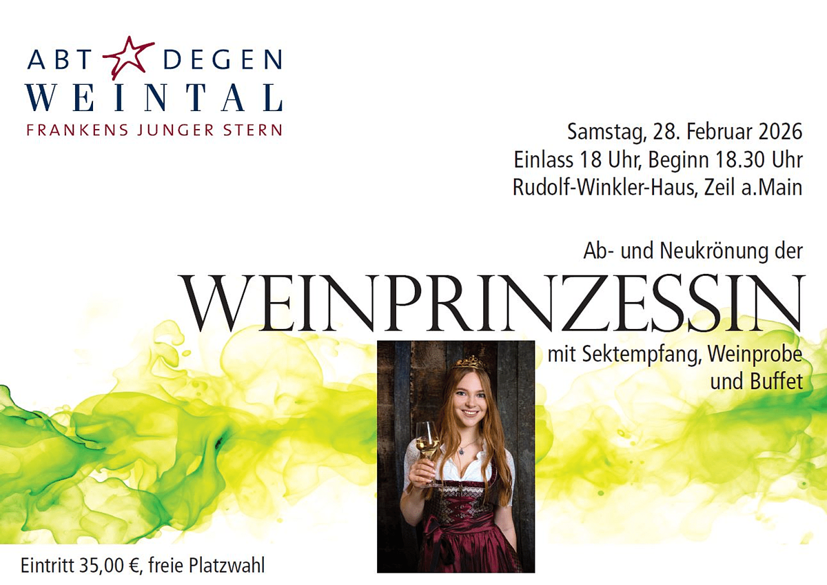 "Johanna I." verlässt den “Thron” der Weinprinzessin des Abt-Degen-Weintals. Am Samstag 28.02.2026 wird eine neue Prinzessin gekrönt. Lasst euch dieses besondere Ereignis nicht entgehen und seid dabei im Rudolf-Winkler-Haus in Zeil am Main!