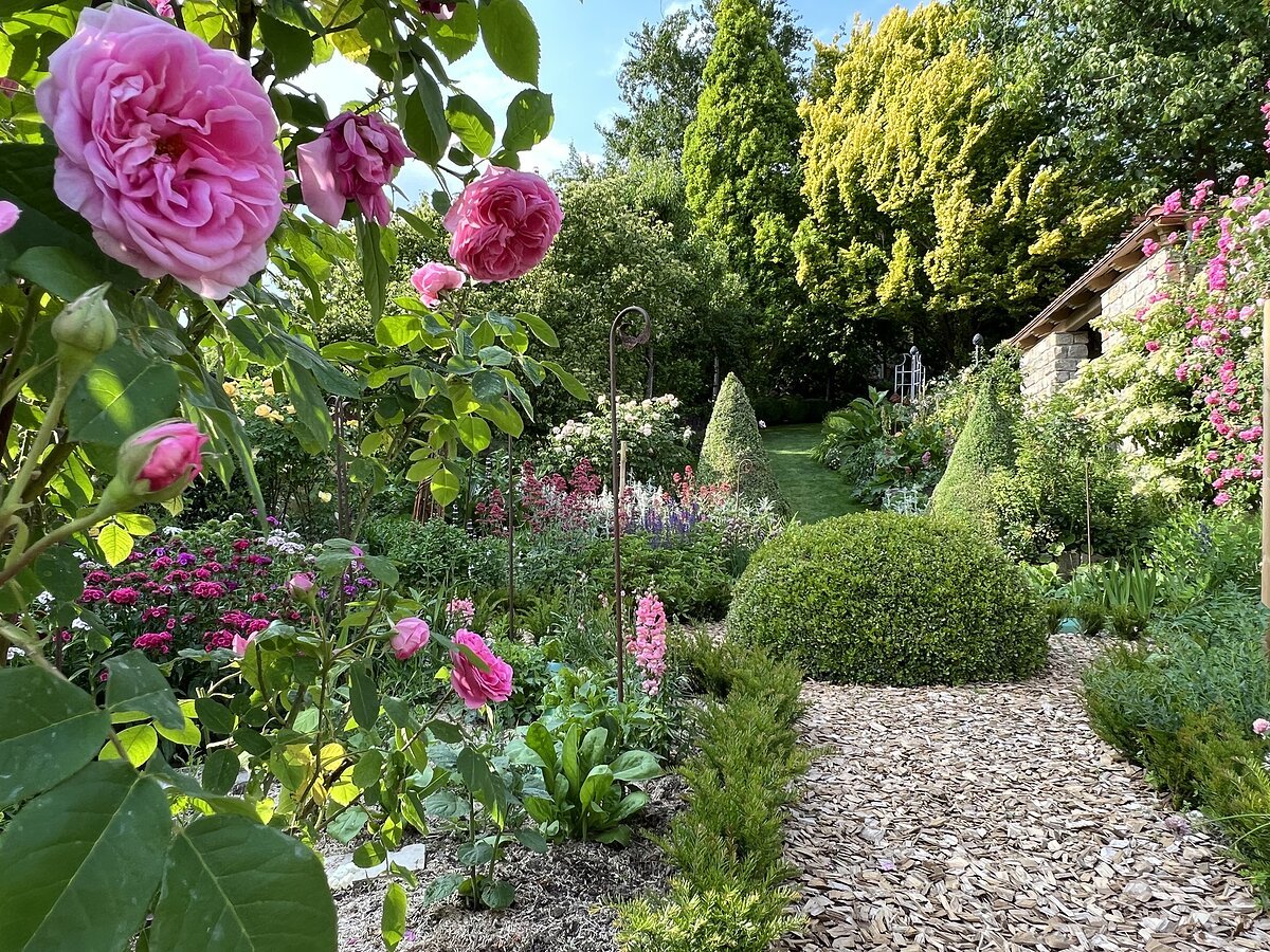 Lustwandeln Sie teils unter schattigen alten Bäumen und entdecken Sie die Vielfalt an Gehölzen und Stauden. Viele Sitzgelegenheiten laden zum Verweilen ein. Besonders Rosenfans kommen jetzt auf Ihre Kosten.