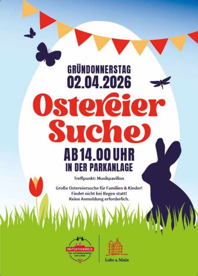 Am Gründonnerstag lädt der Initiativkreis City- und Stadtmarketing Lohr gemeinsam mit der Stadt Lohr a.Main zu einer großen Ostereiersuche für Familien und Kinder ein.