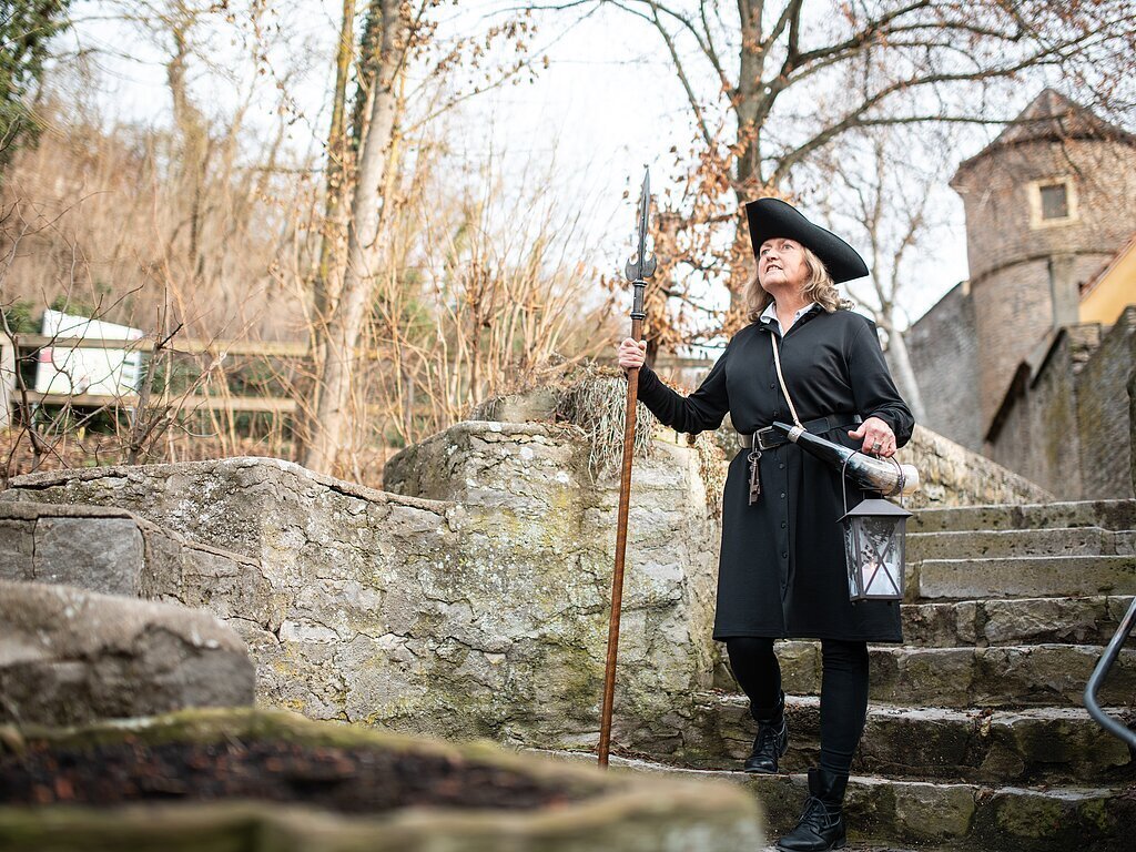 Nachtwandeln Sie mit dem „wachen Auge und dem niemals schlafenden Ohr“ der Nachtwächterin auf Ihrem Rundweg durch die bewegte Geschichte Dettelbachs.