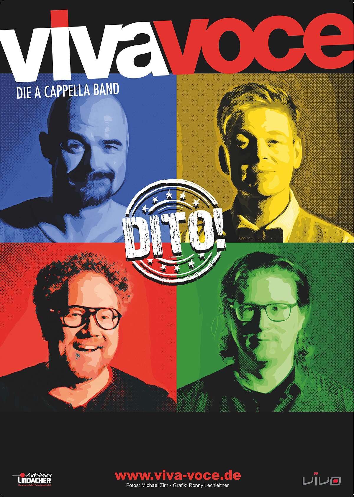 Verliebtheit, Lebenslust, Lachen – aber manchmal auch Faulheit und Trübsinn oder die unvermeidbaren Fallstricke des Alltags verbinden alle Menschen. Das geht den A‐Capella Großmeistern von VIVA VOCE natürlich ganz genauso. Denn mehr als 25 Jahren auf den Bühnen der Welt haben David Lugert, Bas Hupfer, Heiko Benjes und Andreas Kuch mit ihrem Publikum gemeinsam viel erlebt. DITO! Nach dem riesigen Erfolg der Glücksbringer‐Tournee kommen die 4 Sänger mit einer neuen Show: DITO! Darin besingen sie, was die Menschen verbindet: kleine Peinlichkeiten, zum Beispiel, die uns allen schon passiert sind. Und die sich doch einen Moment lang anfühlen wie das Ende der Welt und die Grundlage für nächtelanges Grübeln sind. VIVA VOCE bringt in dieser Show außerdem in einem ihrer berühmten Medleys die ganz großen Hits der A Cappella‐Welt mit. Solidarisch helfen die hochklassigen Sänger natürlich auch bei den unerwarteten Herausforderungen eines jeden Konzerts: Klatscht man jetzt korrekterweise auf die 1 und die 3 oder auf die 2 und die 4 bei einem Song mit? DITO! – das bedeutet auch, mit schwereren Gefühlen und Entscheidungen nicht alleine zu sein. Der warme Bass von Heiko Benjes macht auch Melancholie und Sehnsucht erträglich. David Lugerts Tenor bringt Popsongs genauso zum Schweben wie klassische Melodien. Bas Hupfer als stimmbegnadeter Bühnenkomödiant garantiert Humor und Leichtigkeit, Andi Kuch als lebendes Schlagzeug immer den richtigen Takt. Die perfekten Zutaten für Standing Ovations und begeistertes Publikum. Lassen Sie sich einen Abend lang in den Arm nehmen von den unvergleichlichen Stimmen von VIVA VOCE. Präzise, brillant und immer mit einem kleinen Augenzwinkern garantieren die 4 Jungs einen Abend, der noch lange im Herzen des Publikums nachhallen wird. Und die Zuhörerinnen und Zuhörer vielleicht ein bisschen mutiger, ein bisschen heiterer und ein bisschen freundlicher in die Welt zurückschickt. Denn jetzt wissen sie ja: den anderen geht es ganz genauso! DITO!
