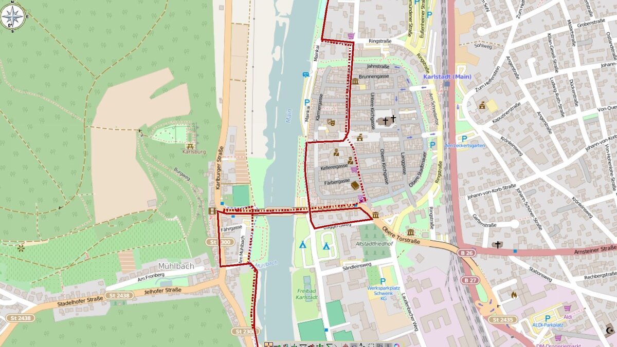 In Karlstadt-Mühlbach (km 27), kurz vor der Mainbrücke, biegen die Radelnden immer den Wegweisern folgend, einmal links und sechs Mal rechts (über die Mainbrücke, in den Baggertsweg zum Parkplatz am Main, entlang der Stadtmauer bis zum Maintor) in die historische Altstadt von Karlstadt (km 28). Umgeben von Fachwerkfassaden lädt die Stadt zu einer kurzen Pause ein. Anschließend überqueren Sie den Marktplatz mit Blick auf das Historische Rathaus nach links und fahren am Ende der Hauptstraße wieder links zur Mainpromenade, immer den Wegweisern mit den Zielen Gemünden / Wernfeld folgend am Main entlang. Bis zum Karlstadter Ortsteil Gambach können Sie noch die letzten Weinberge des Maindreiecks genießen.